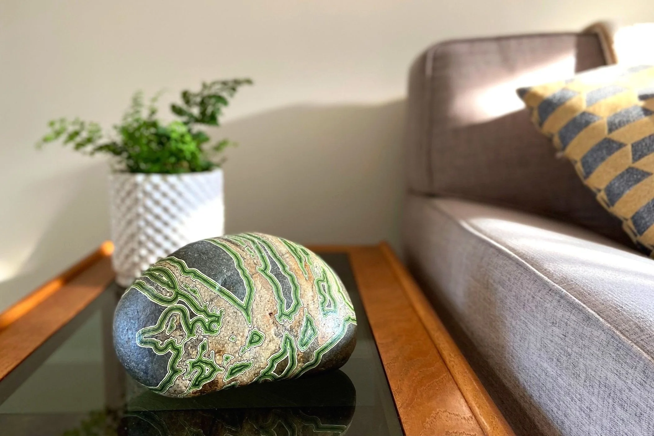 Each stone is carefully selected from the creeks, rivers and beaches of Vancouver Island, then hand-painted with layered lines of acrylic paint and ink.